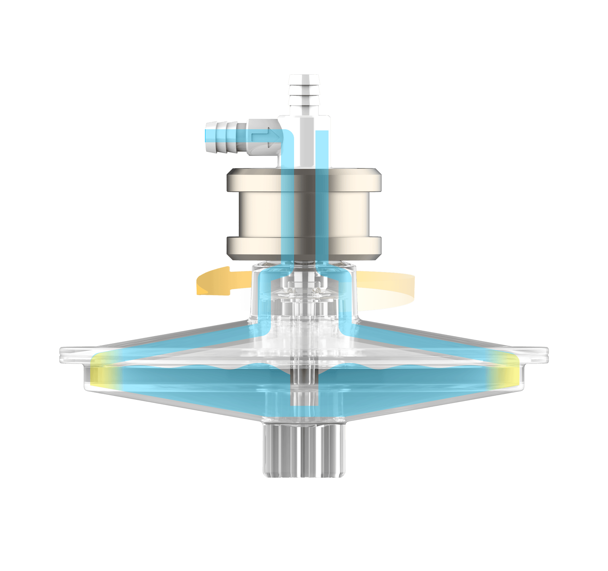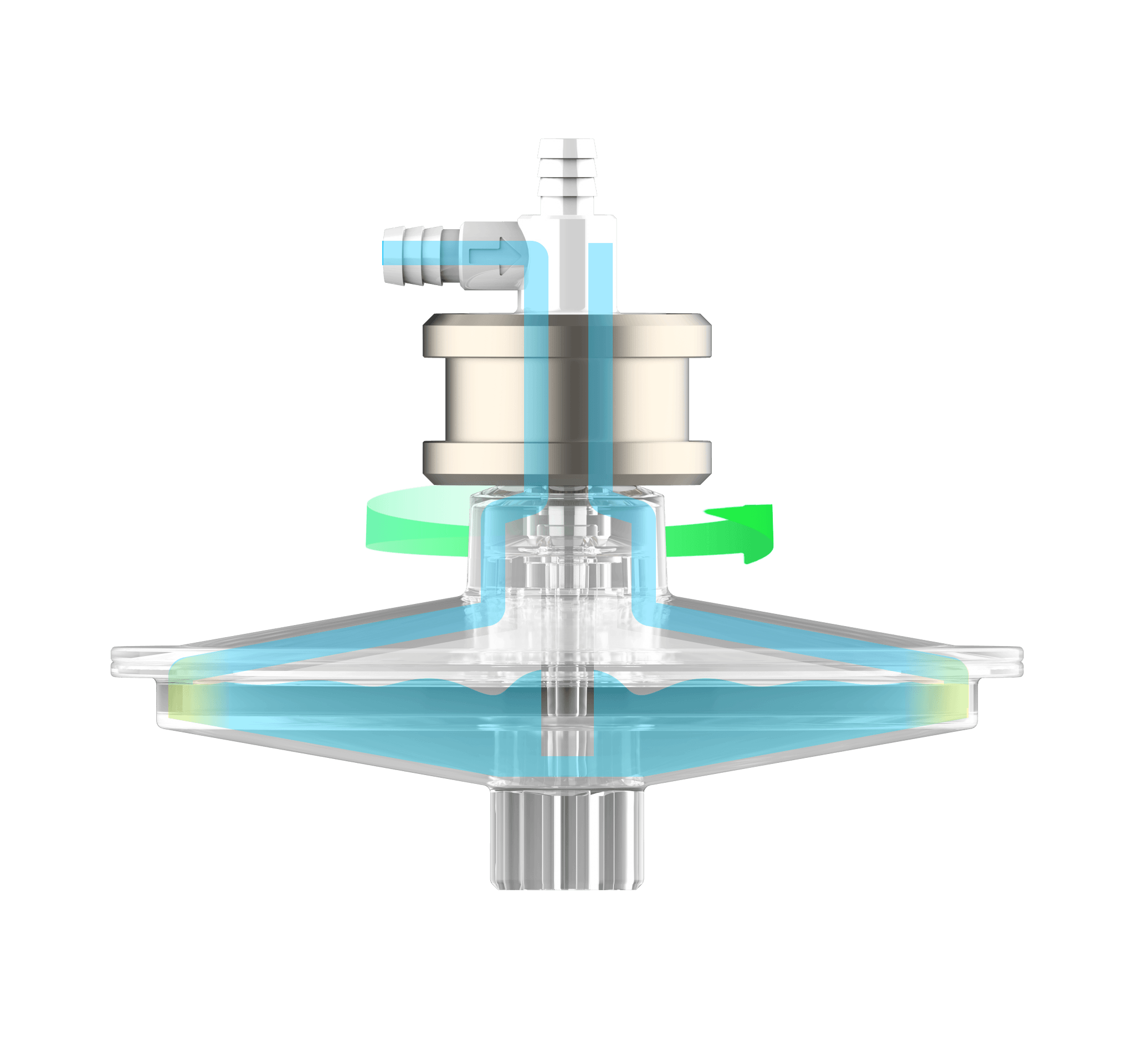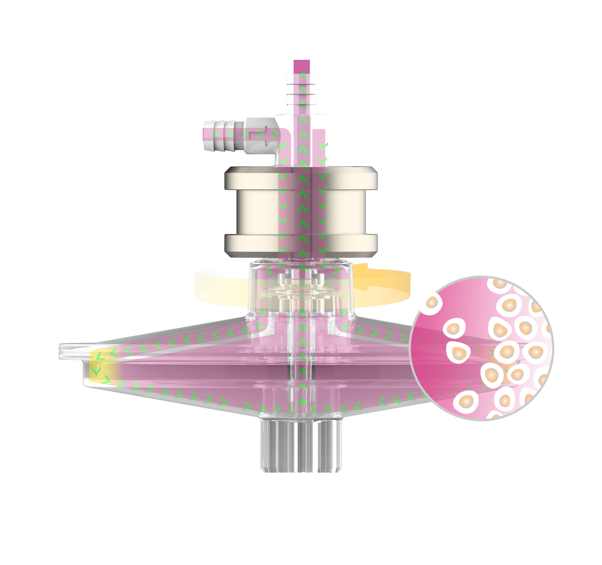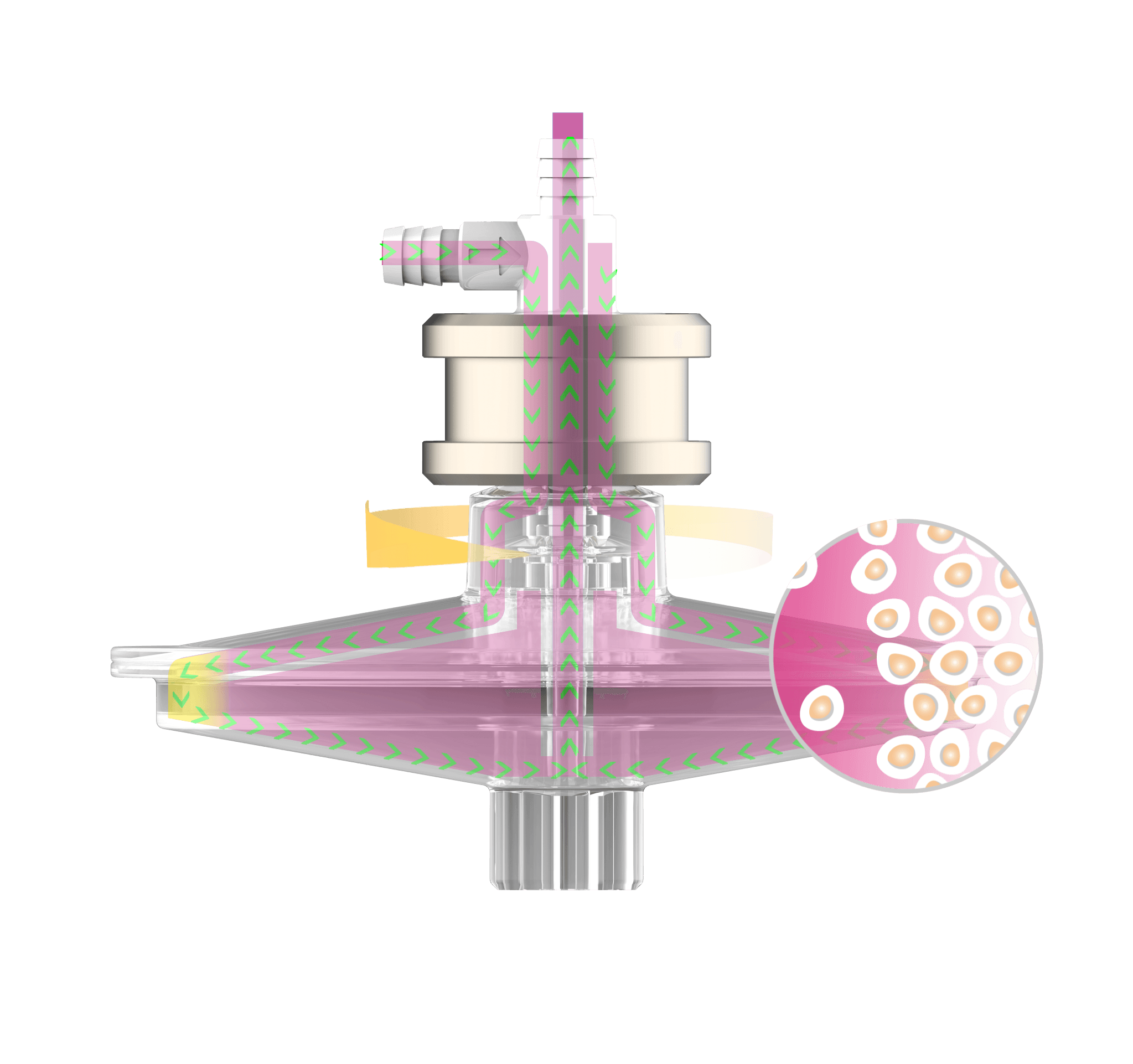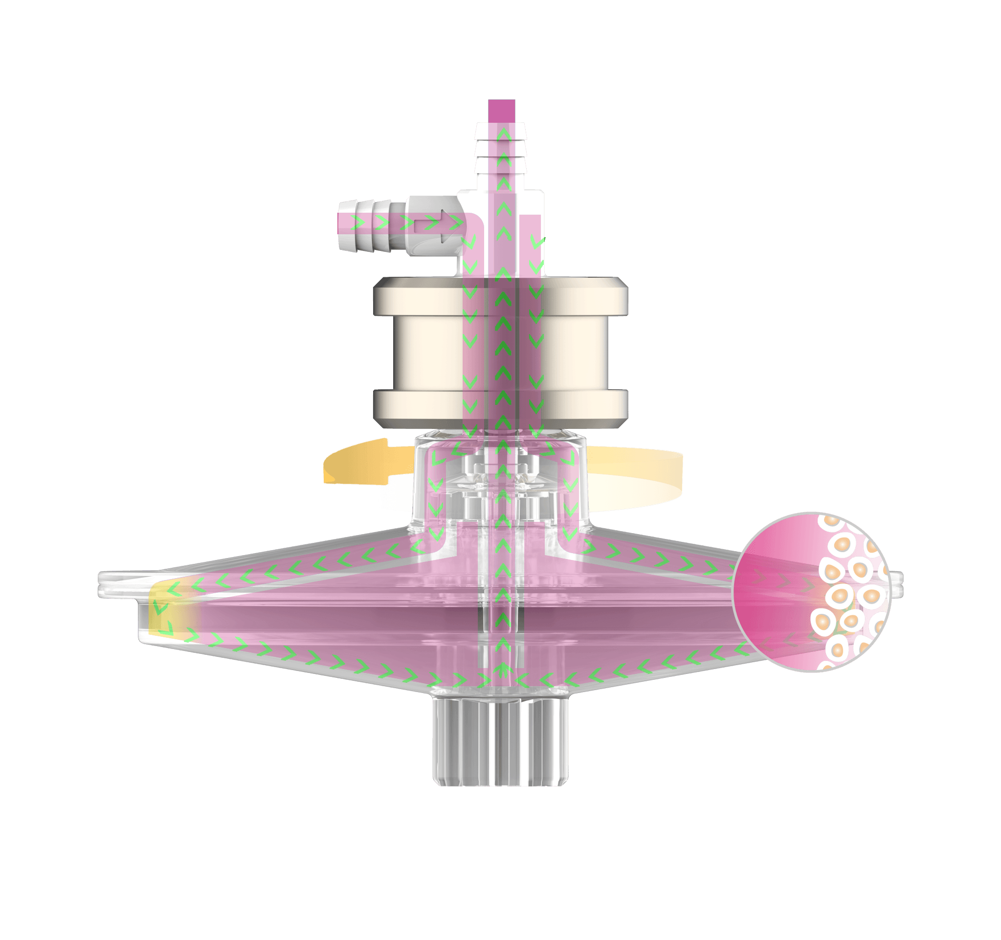 细胞液通过蠕动泵持续流过离心杯,在离心力的作用下,细胞被截留在杯内,原始培养基排入废液袋,从而实现大体积细胞液的连续处理。