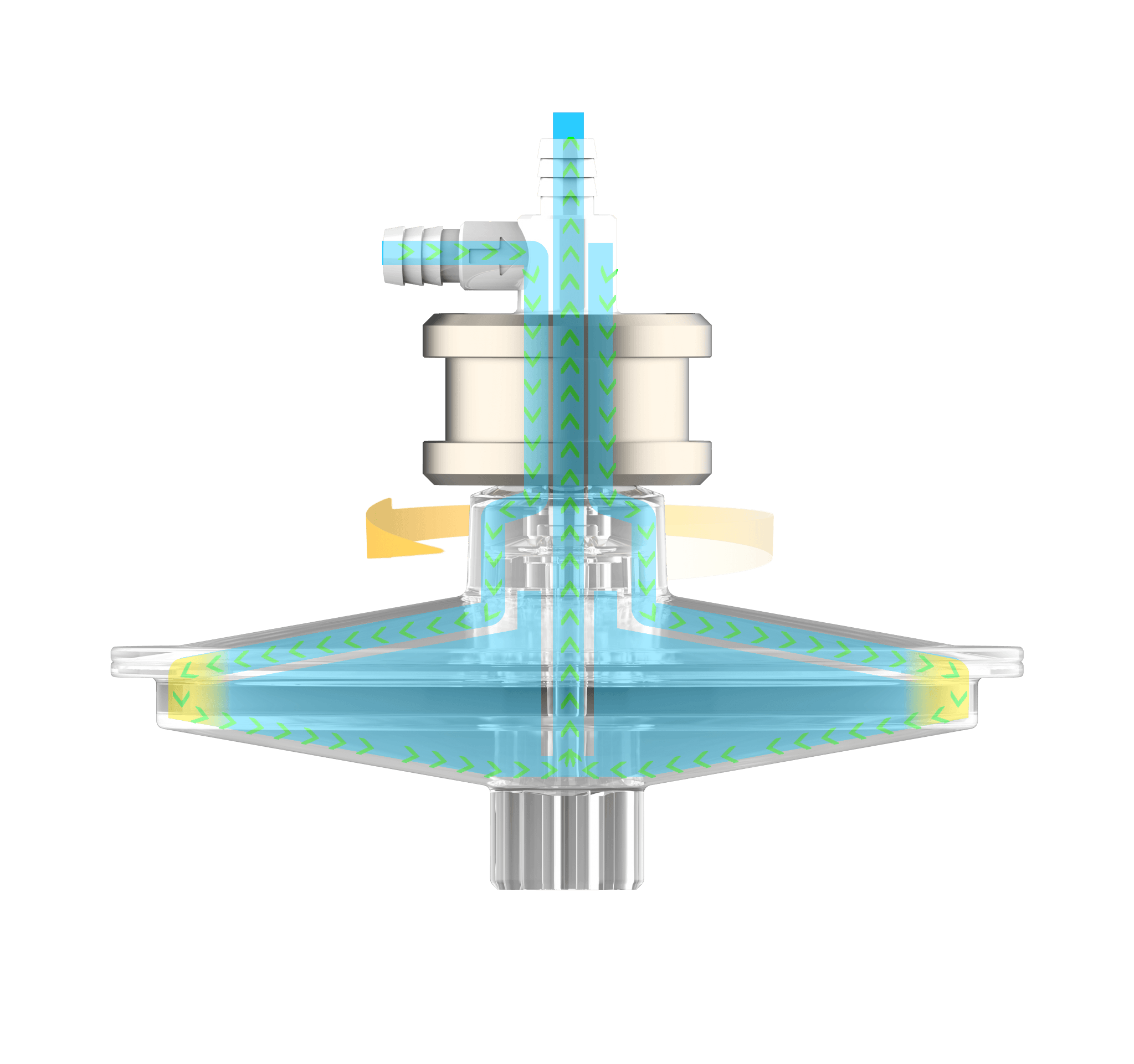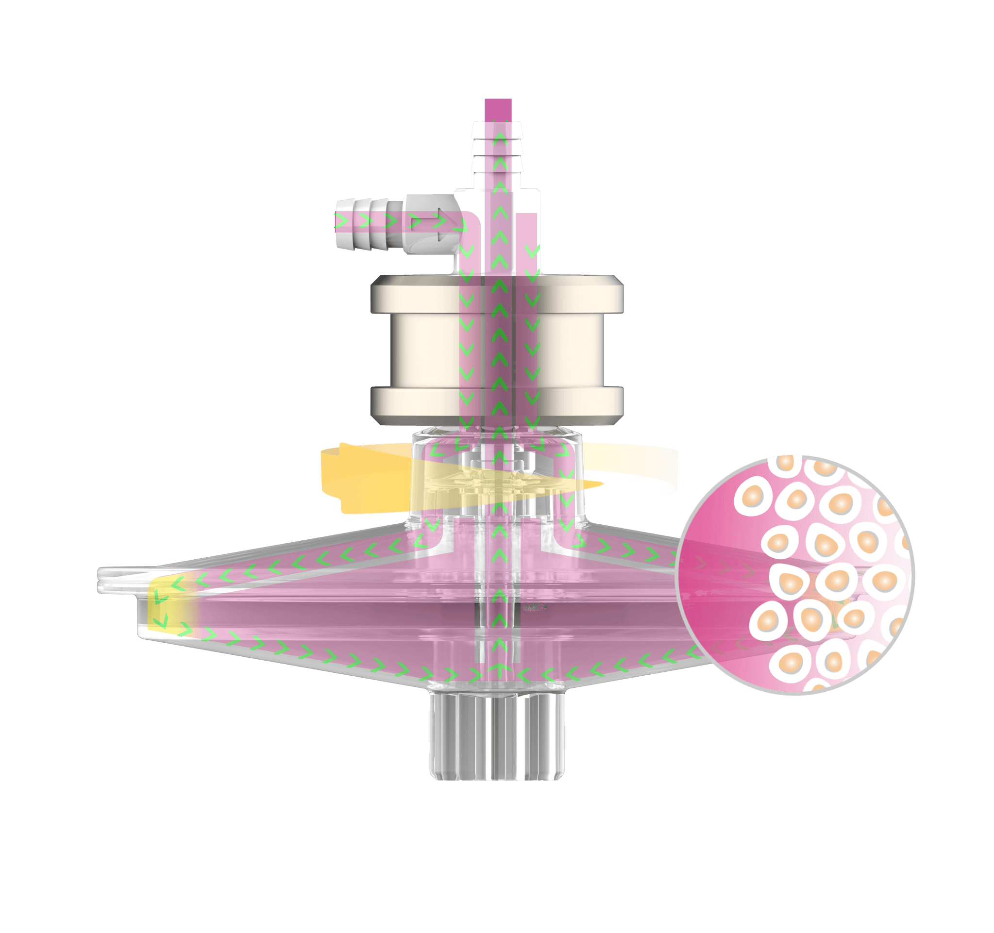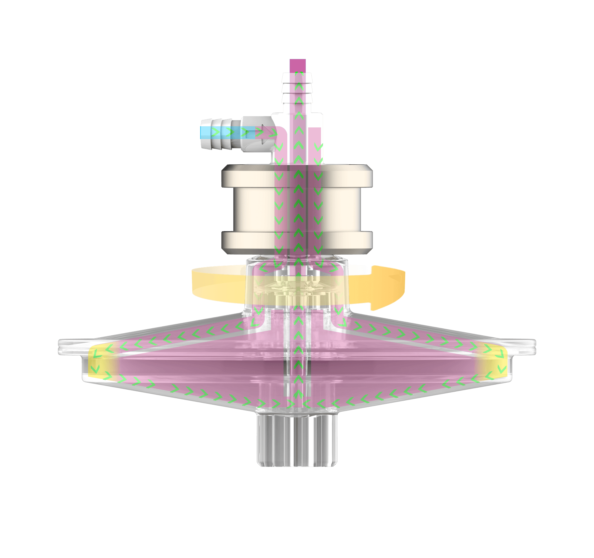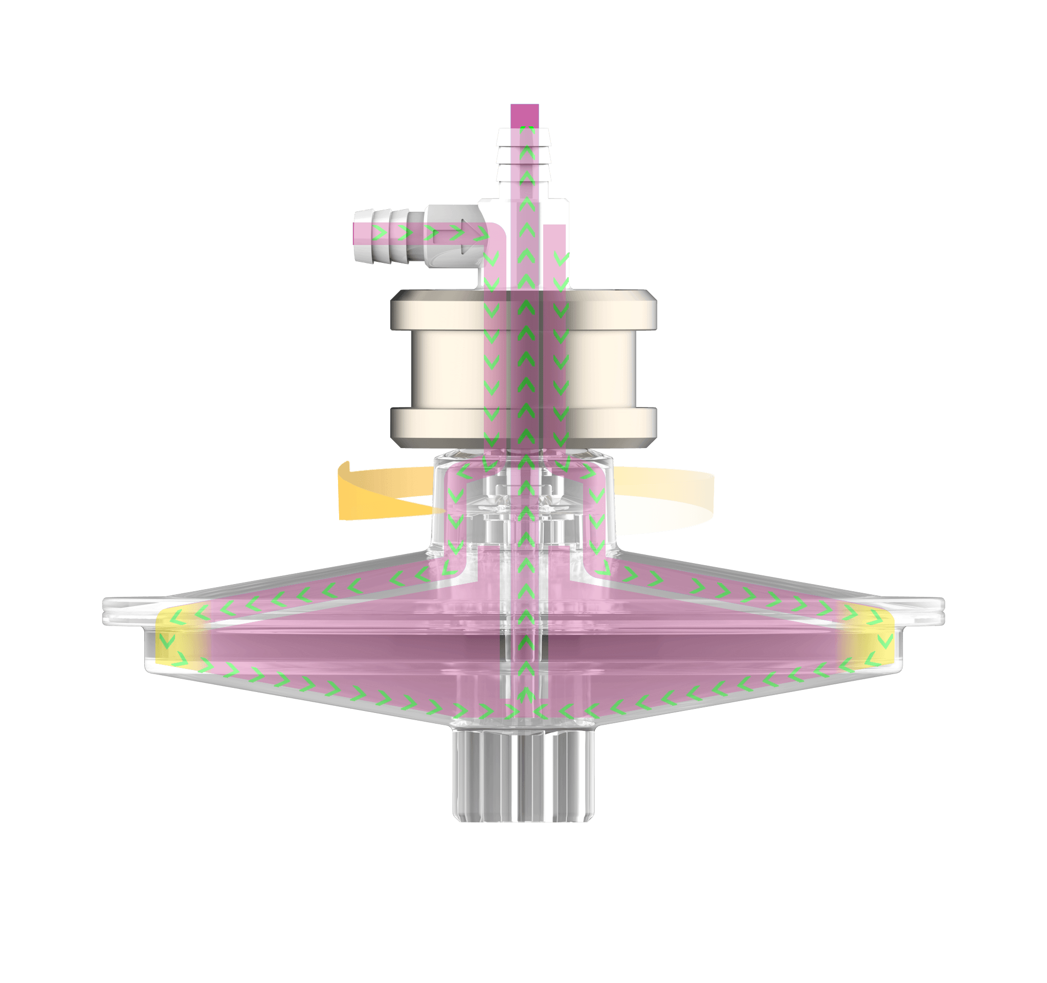 细胞液通过蠕动泵持续流过离心杯,在离心力的作用下,细胞被截留在杯内,原始培养基排入废液袋,从而实现大体积细胞液的连续处理。