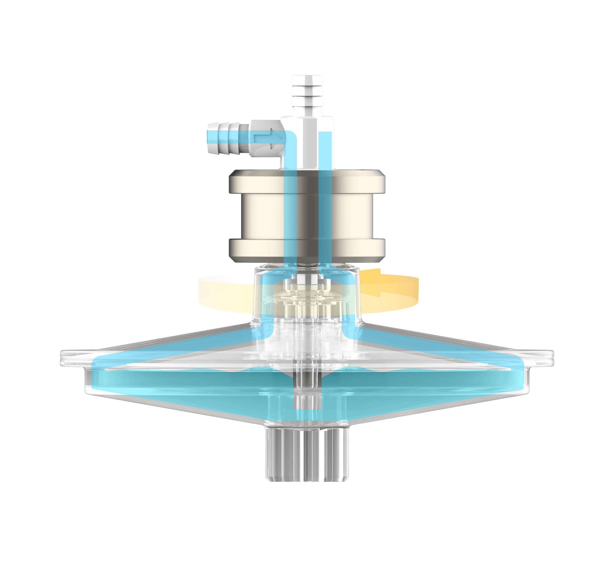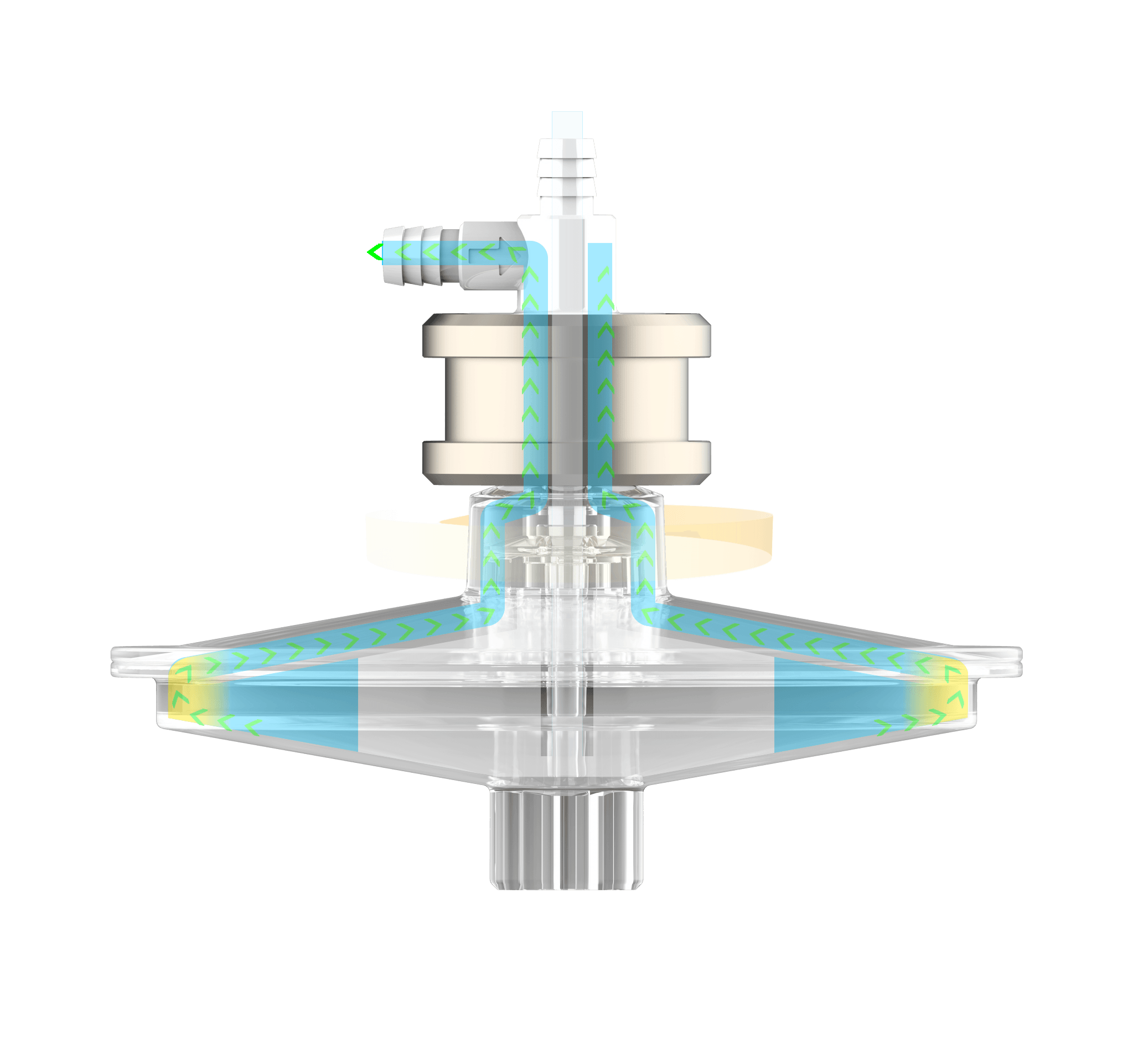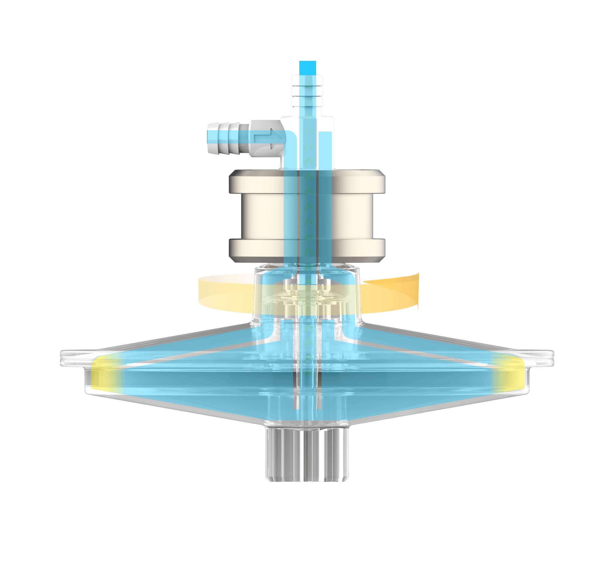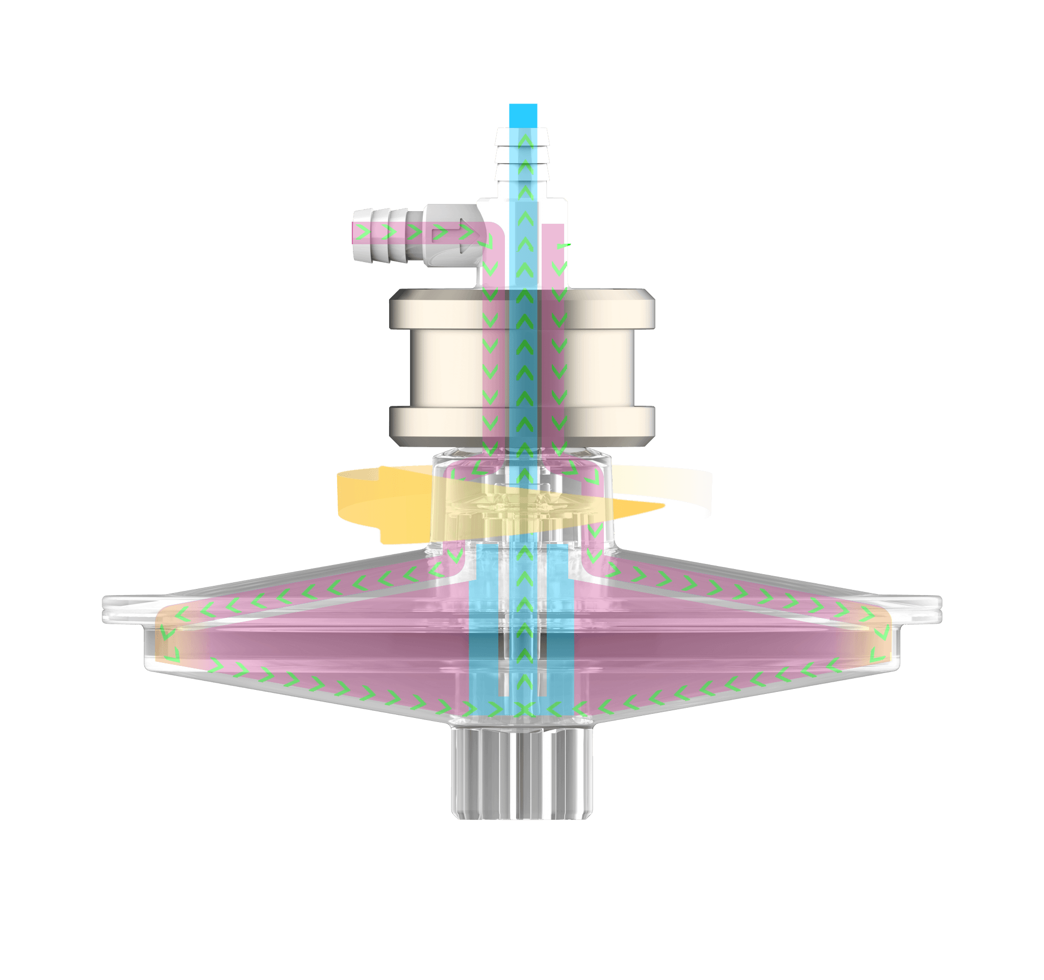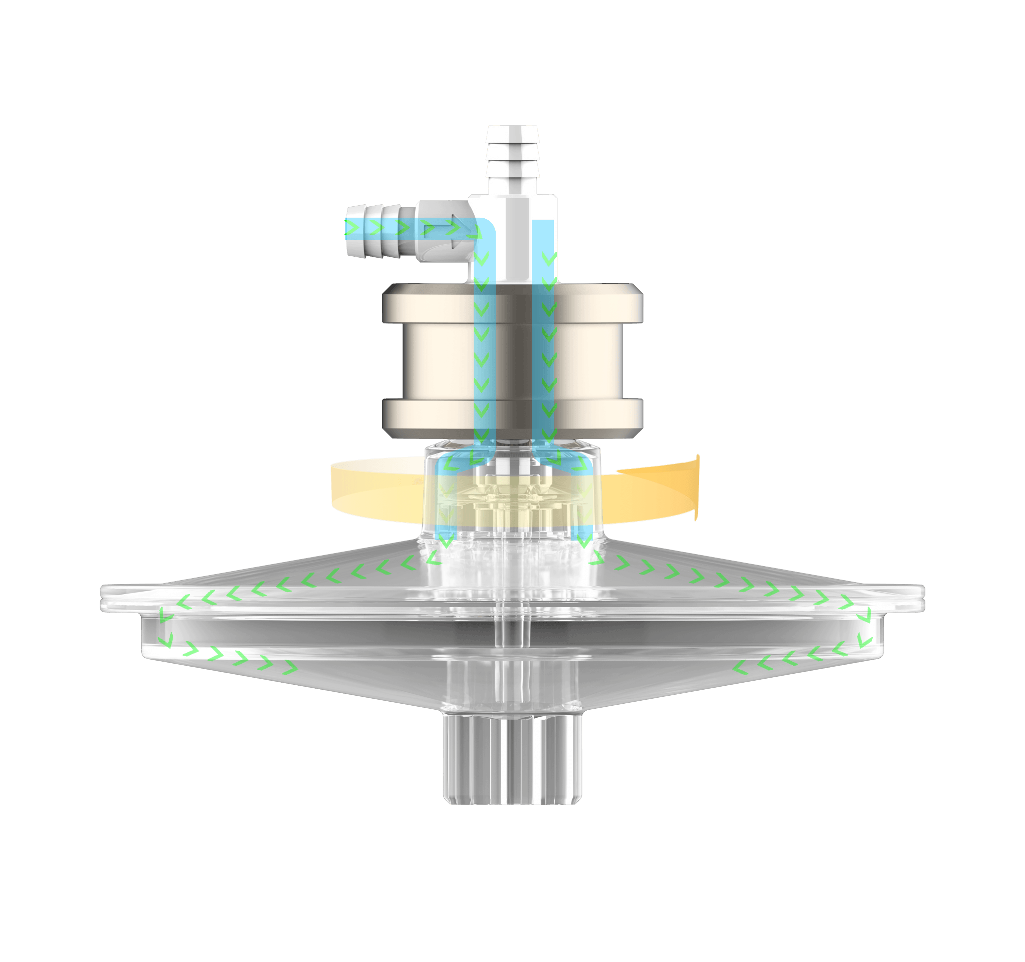 细胞液通过蠕动泵持续流过离心杯,在离心力的作用下,细胞被截留在杯内,原始培养基排入废液袋,从而实现大体积细胞液的连续处理。
