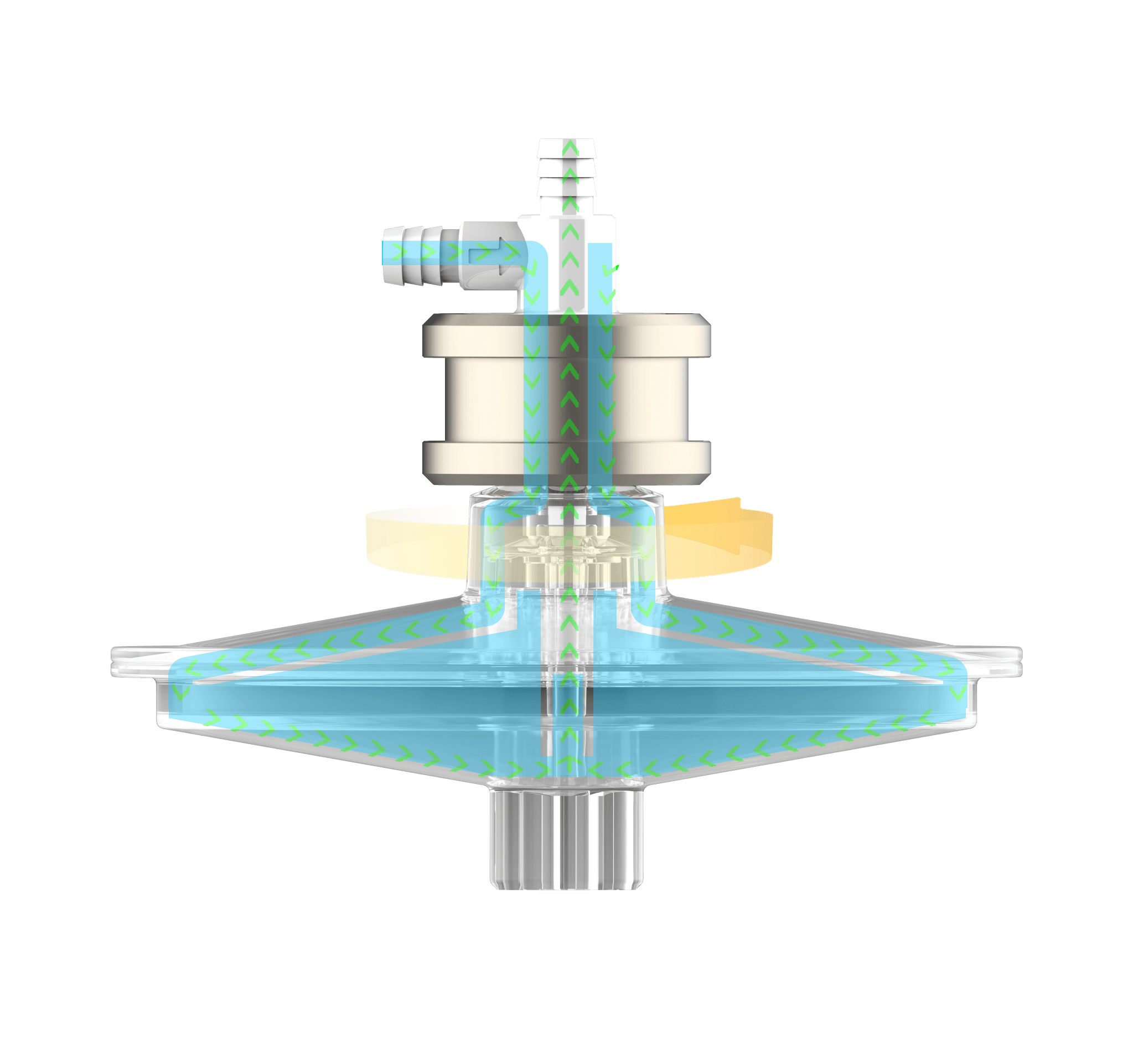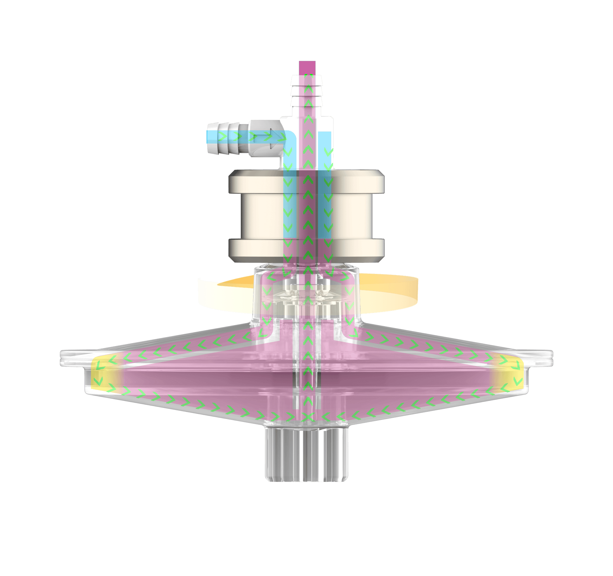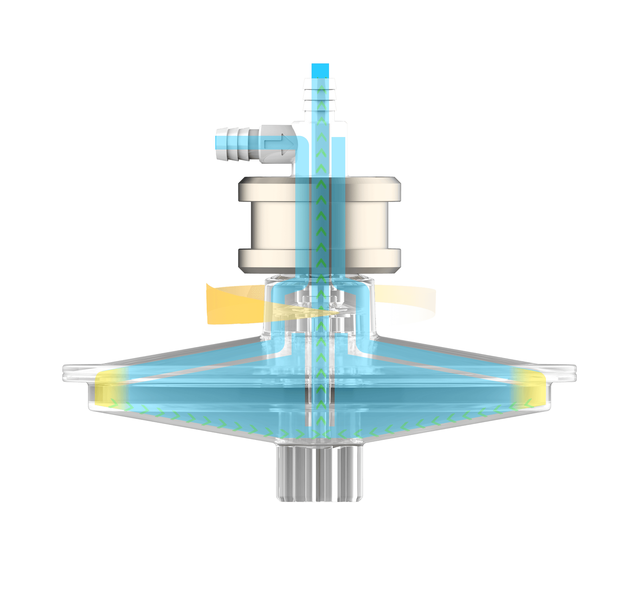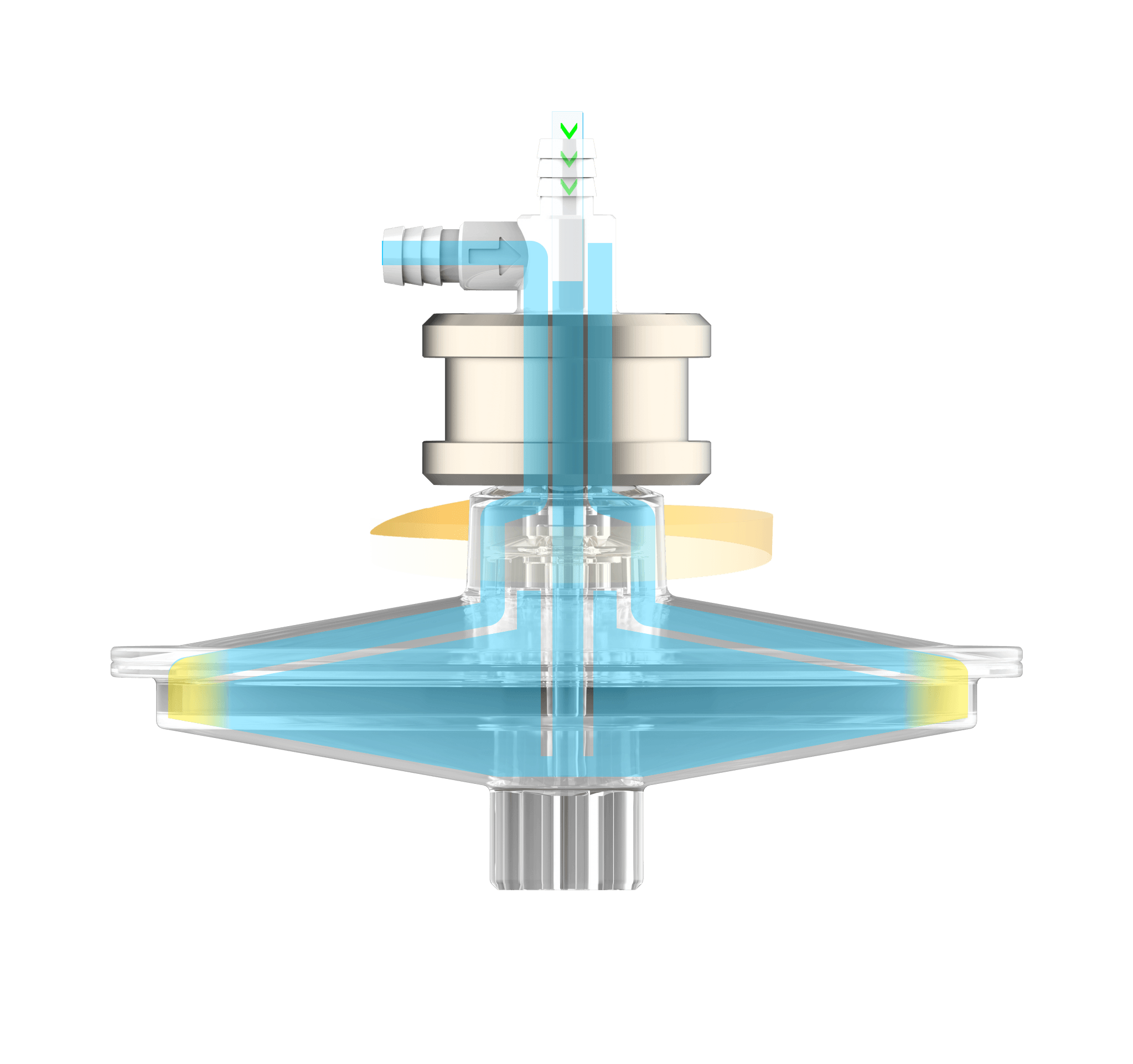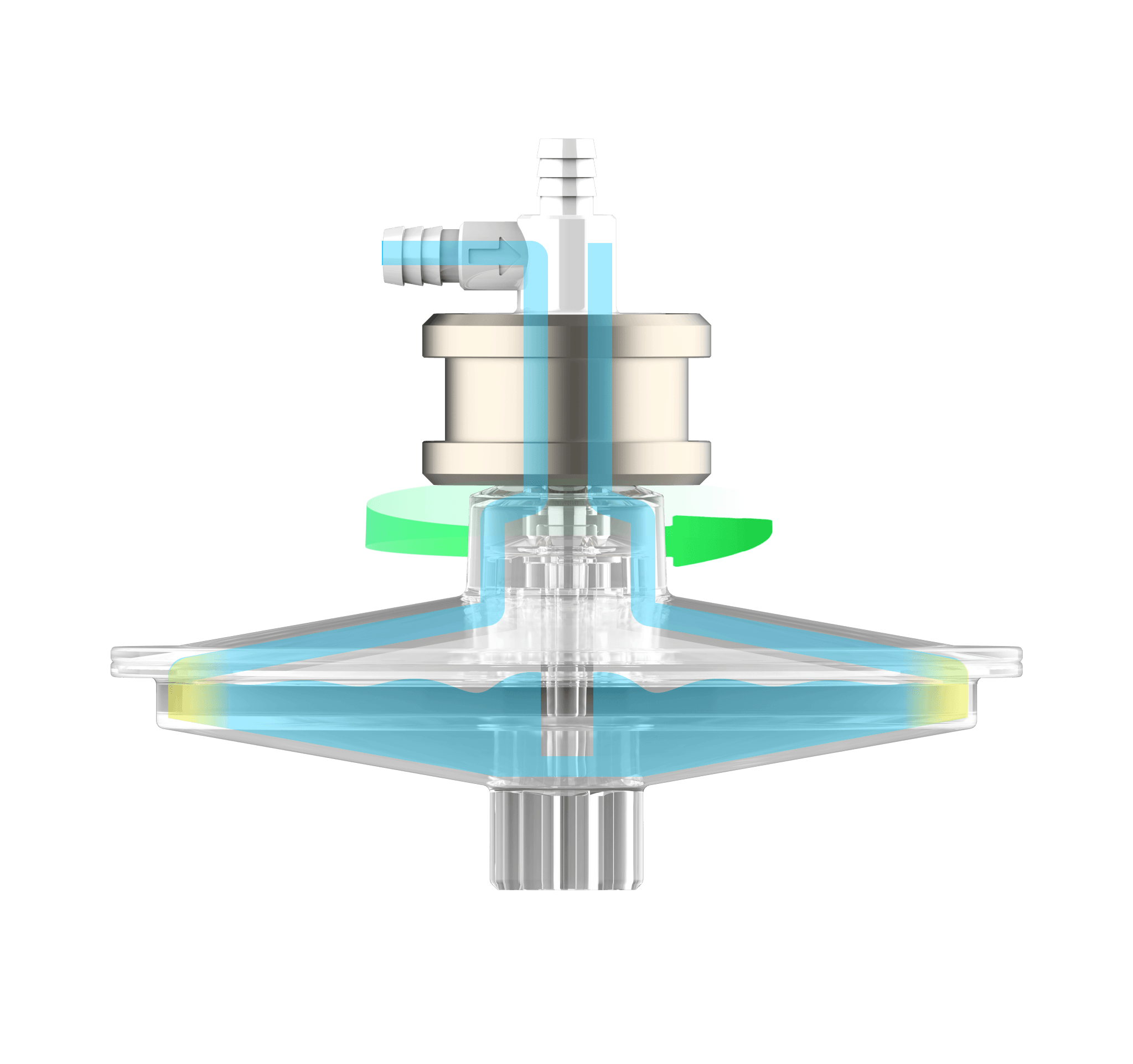 细胞液通过蠕动泵持续流过离心杯,在离心力的作用下,细胞被截留在杯内,原始培养基排入废液袋,从而实现大体积细胞液的连续处理。