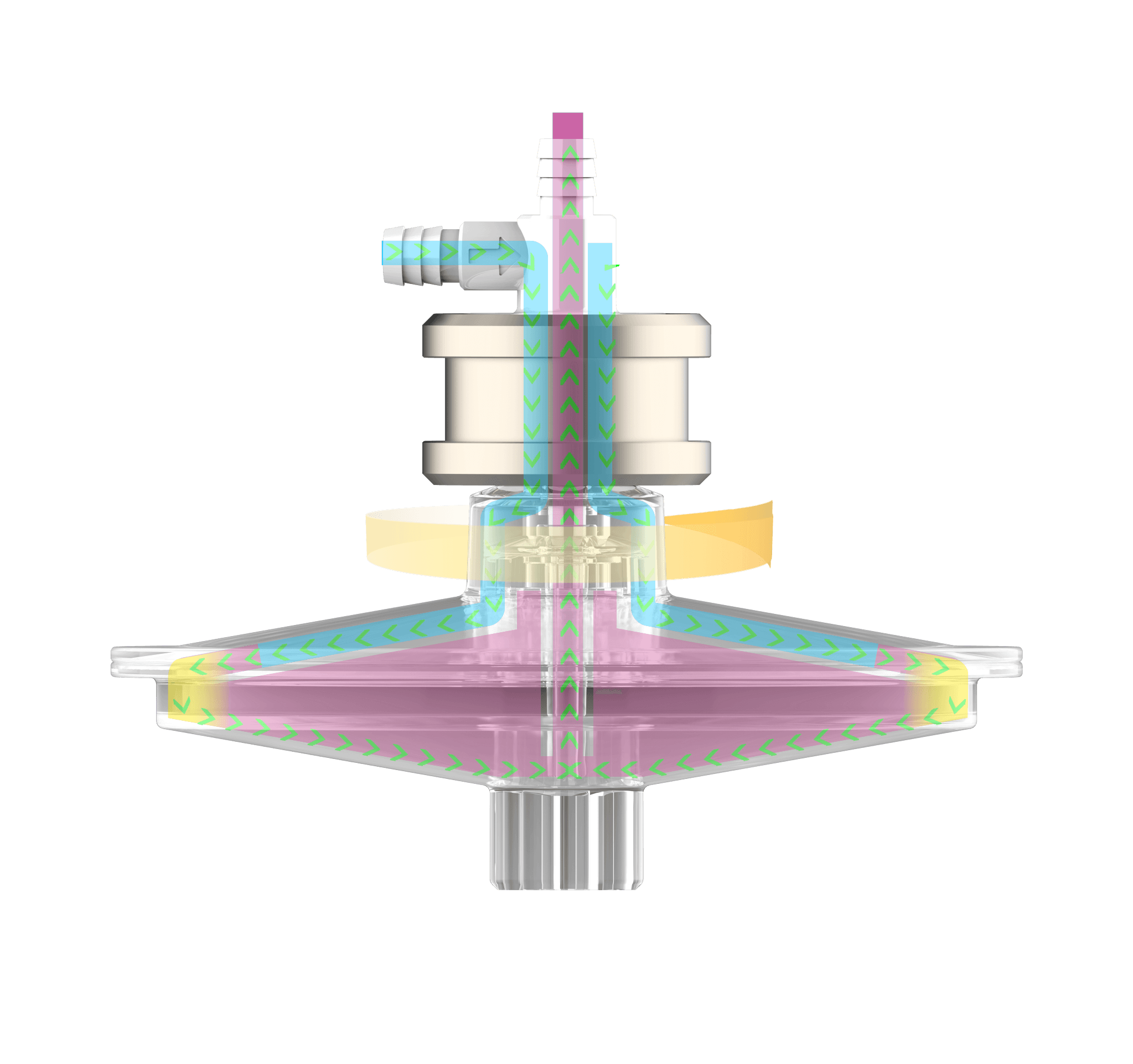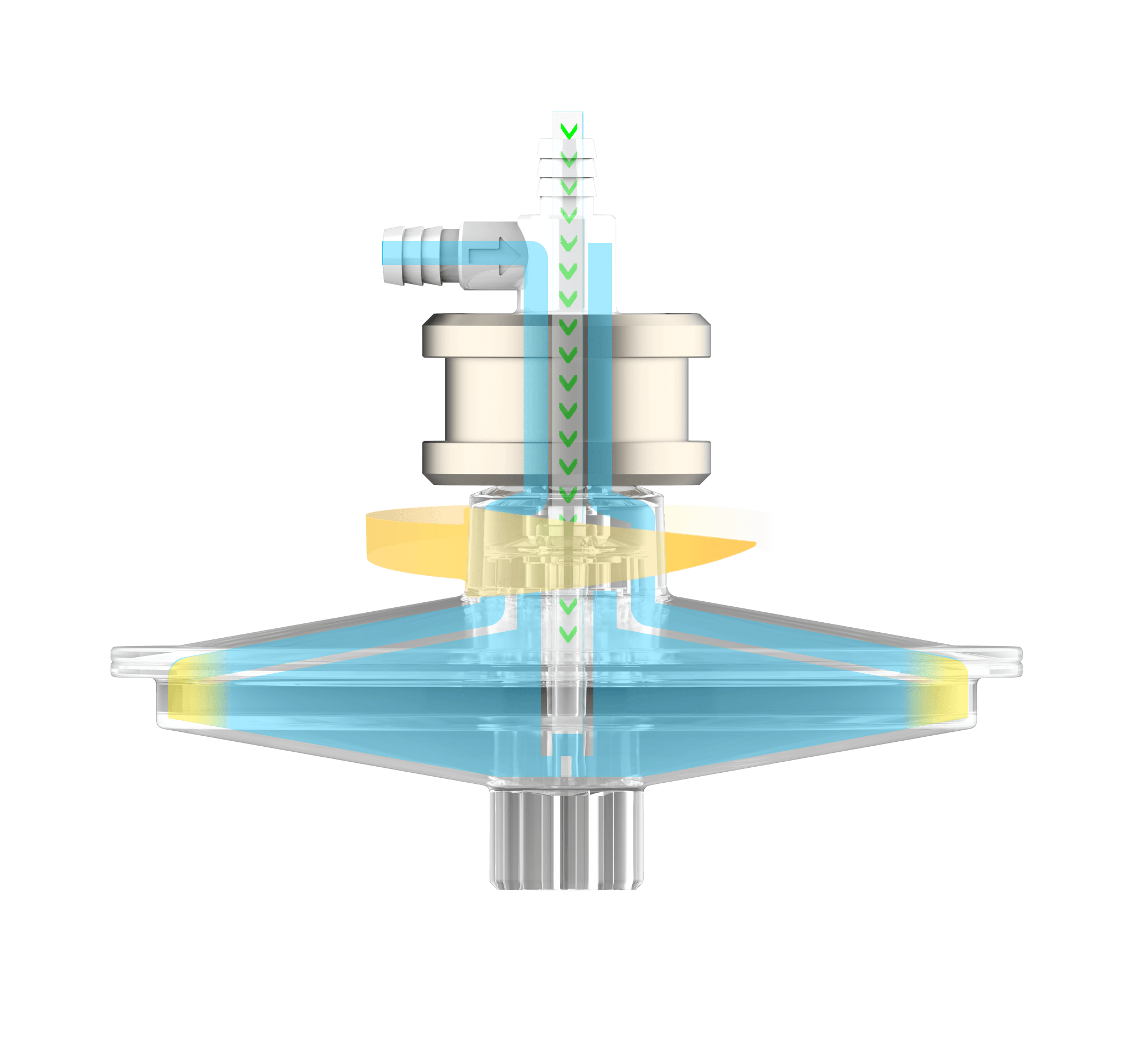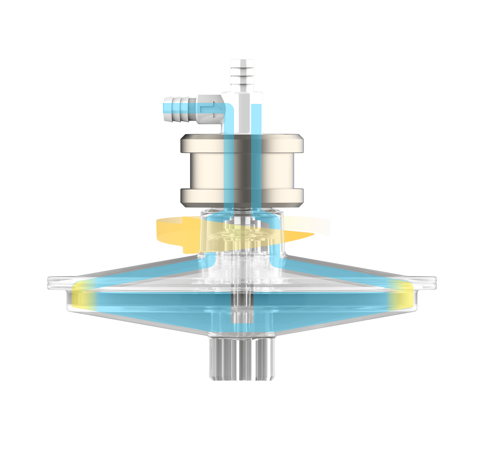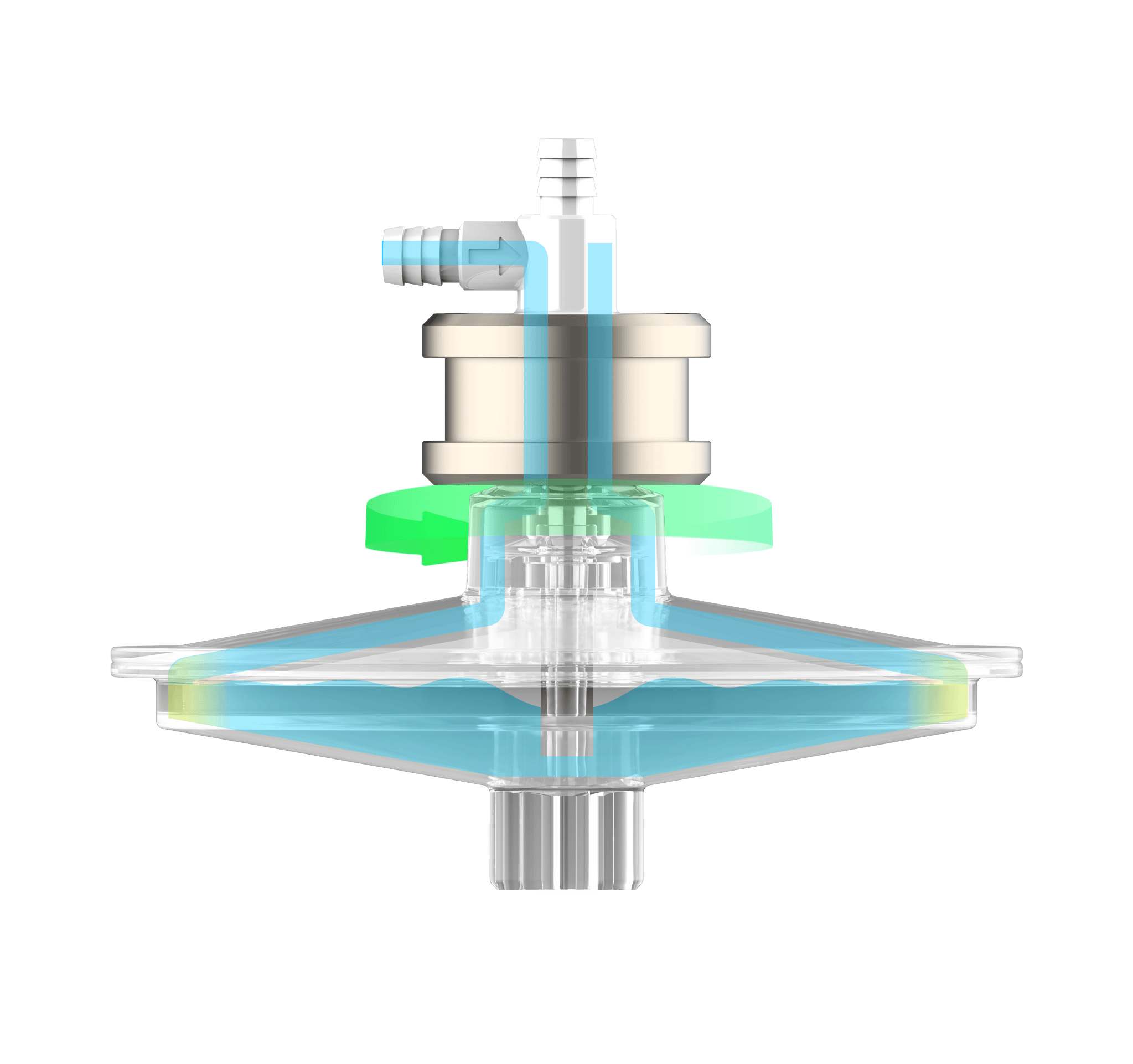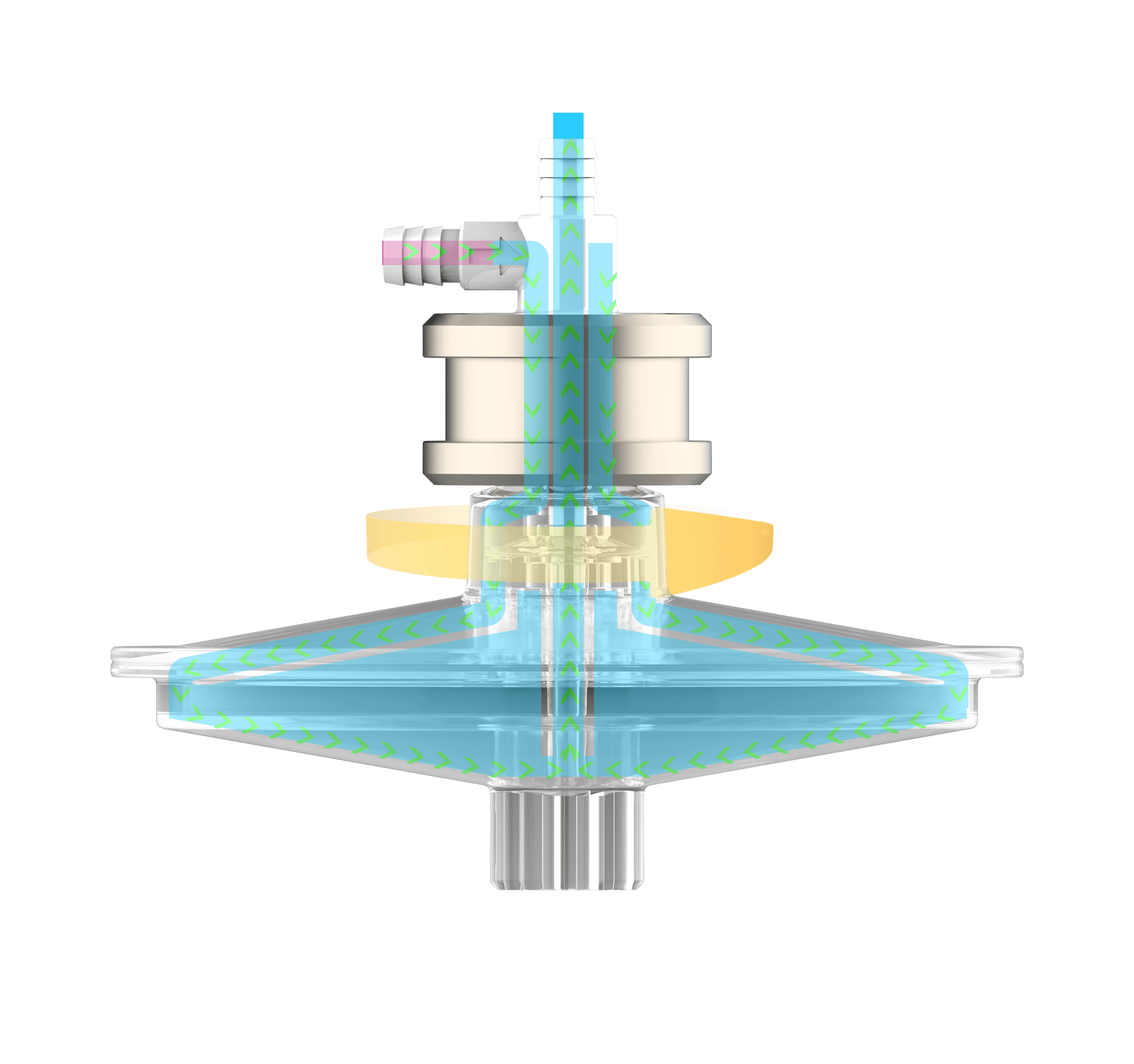 细胞液通过蠕动泵持续流过离心杯,在离心力的作用下,细胞被截留在杯内,原始培养基排入废液袋,从而实现大体积细胞液的连续处理。