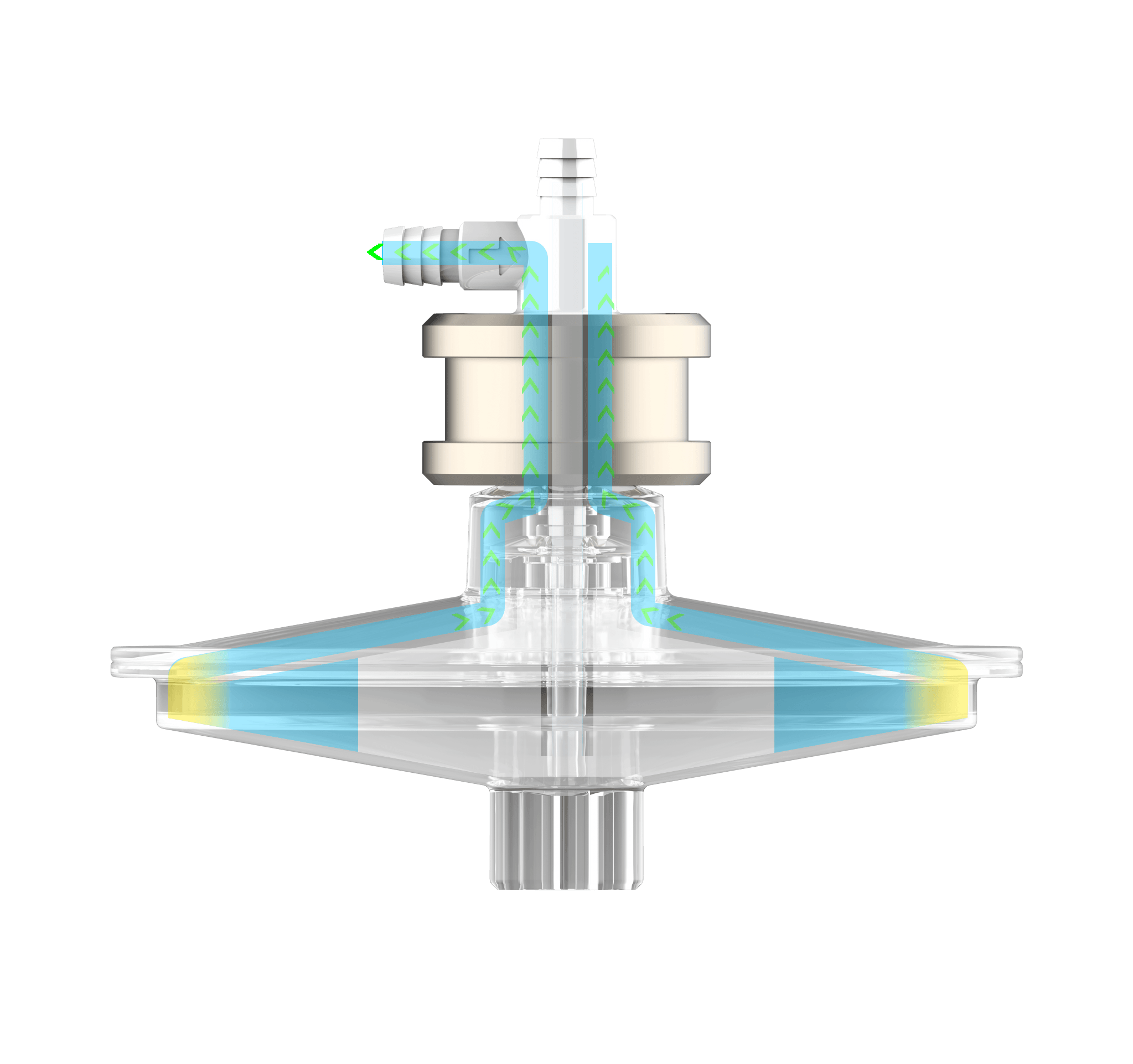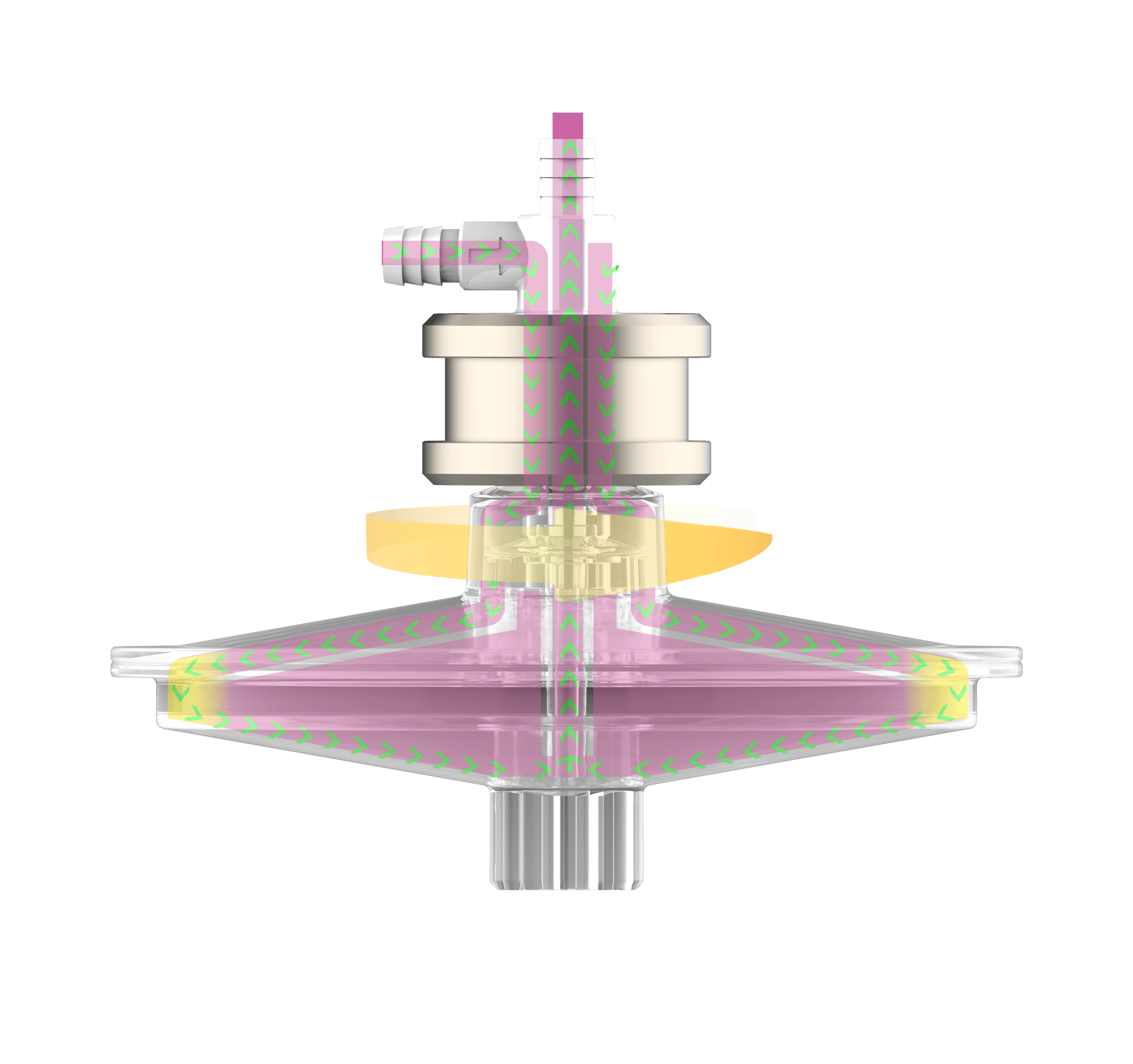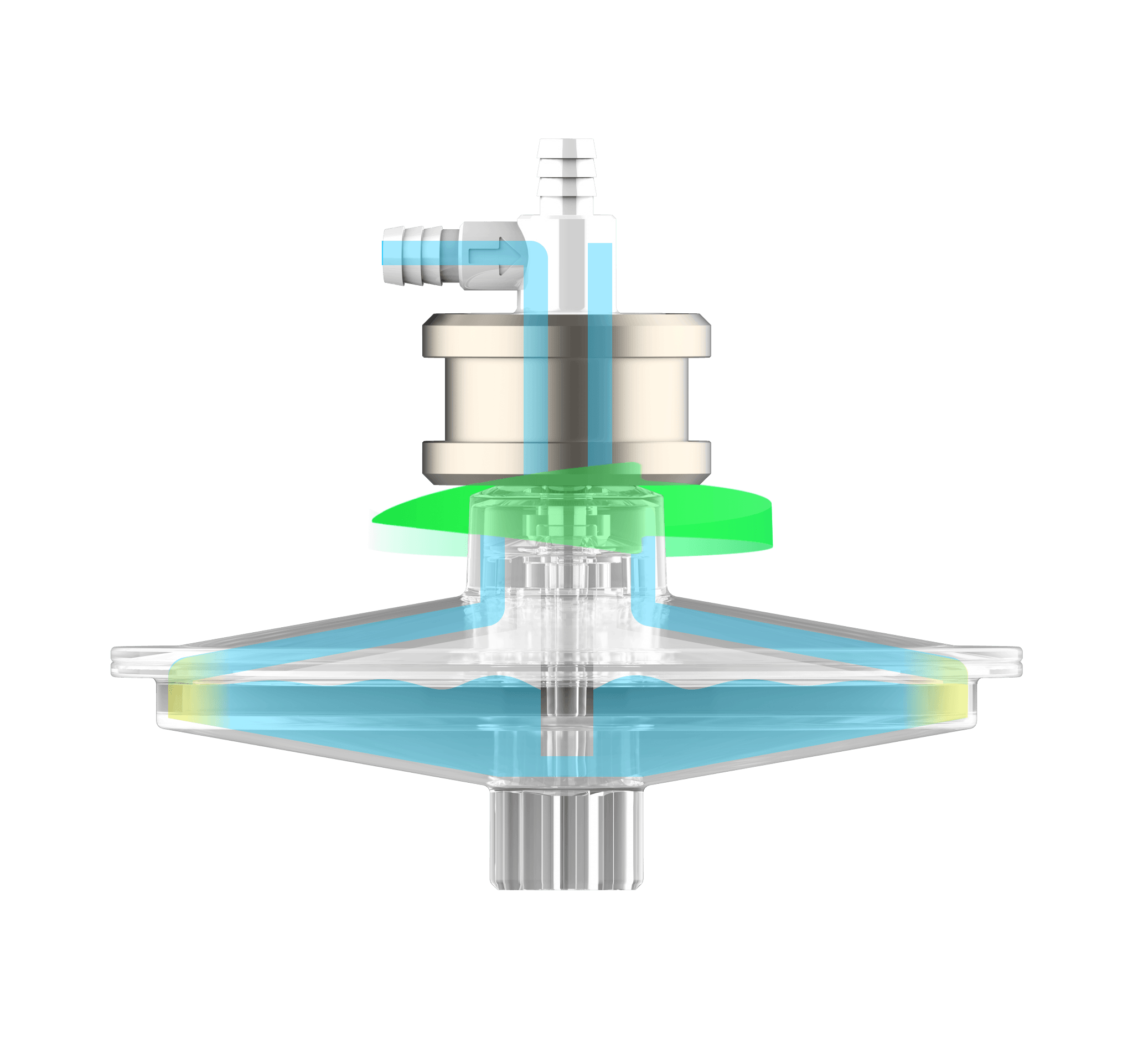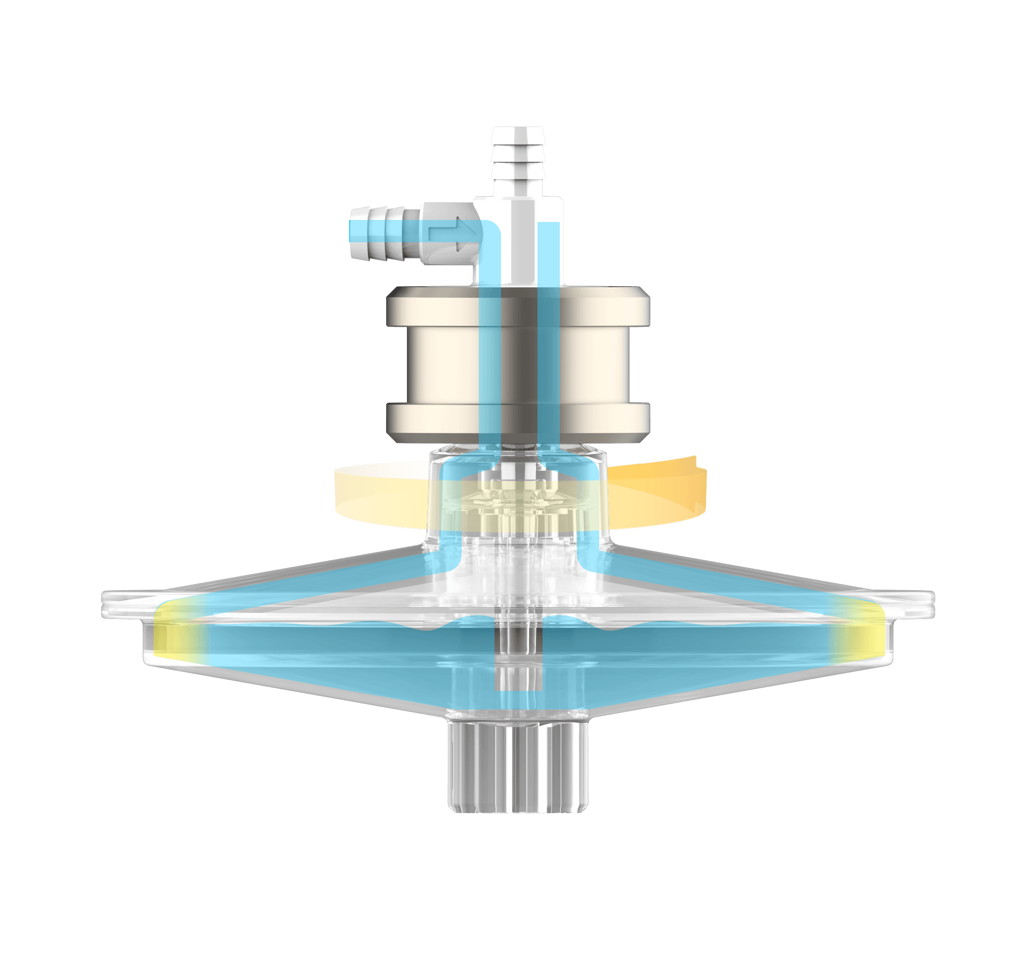 细胞液通过蠕动泵持续流过离心杯,在离心力的作用下,细胞被截留在杯内,原始培养基排入废液袋,从而实现大体积细胞液的连续处理。