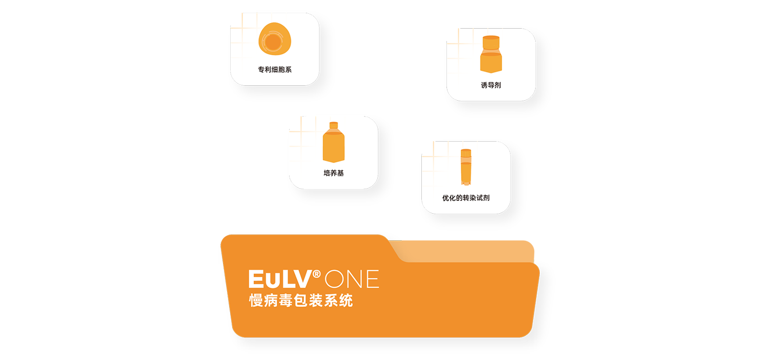 EuLV ONE® 慢病毒包装系统专为搭配 EuLV ONE® 包装细胞的单质粒瞬时转染而设计。这一一站式解决方案包含专有细胞系、优化转染试剂、培养基及诱导剂,所有组件均为实现高病毒产量、操作便捷性与应用灵活性而定制。